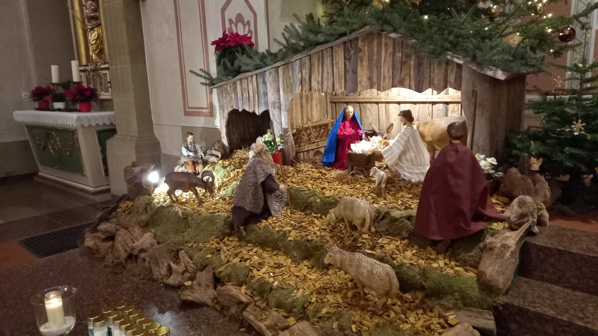 La crèche est installée dans l’église Saint Paulinus, appelée localement « Warndtdom », la cathédrale du Warndt. Sur les marches du sanctuaire est représenté le champ sur lequel les bergers gardent leur troupeau. Au centre se trouve l’étable de Bethléem avec Marie, Joseph et l’enfant Jésus dans la mangeoire. Les personnages en bois sculpté sont entourés d’un bœuf et d’un âne. À partir du 6 janvier, la crèche est complétée par les figurines des rois mages. Particularité : une bougie contenant la lumière de la paix de Bethléem brûle tous les jours près de la crèche. Les visiteurs sont invités à allumer leur propre bougie à la flamme pour l’emporter chez eux.
